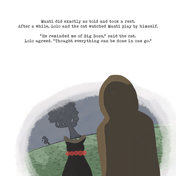 Page 28Munti did exactly as told and took a rest. After a while, Lolo and the cat watched Munti play by himself."He reminded me of Big Boss." said the cat. Lolo agreed."Thought everything can be done in one go."