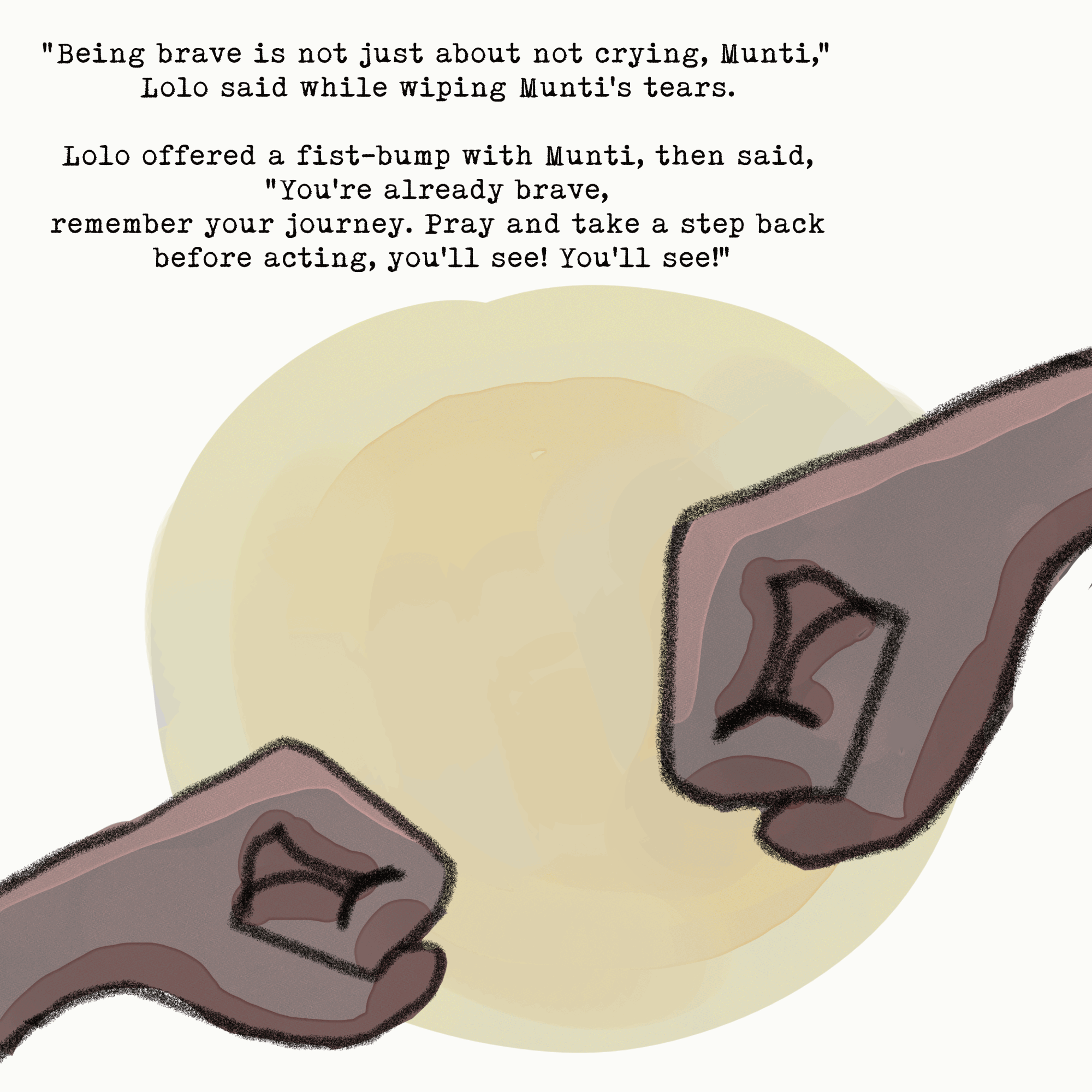 Page 27"Being brave is not just about not crying, Munti." Lolo said while wiping off Munti's tears.Lolo offered a fist-bump with Munti, then said, "You're already brave, remember your journey. Pray and take a step back before acting, you'll see! You'll see!"