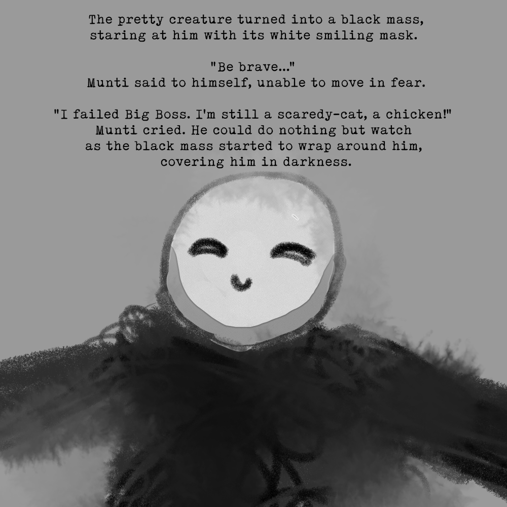 Page 23The pretty creature turned into a black mass, staring at him with its white smiling mask."Be brave..." Munti said to himself, unable to move in fear."I failed Big Boss. I'm still a scaredy-cat, a chicken!" Munti cried.He could do nothing but watch as the black mass started to wrap around him, covering him in darkness.