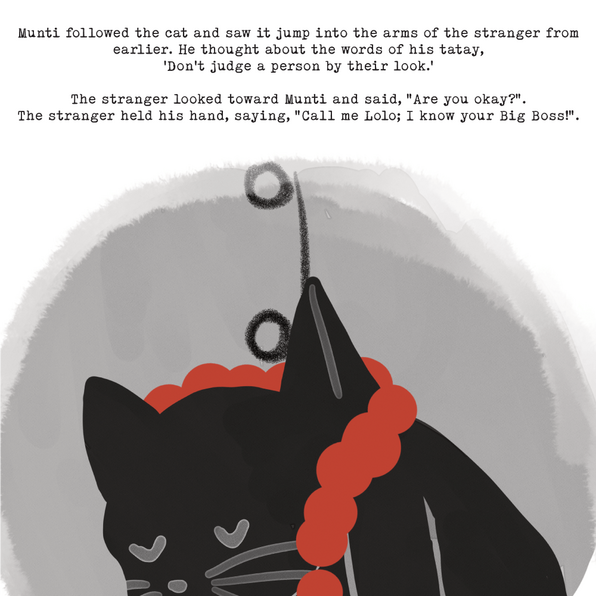 Page 25Munti followed the cat and saw it jump into the arms of the stranger from earlier. He thought about the words of his tatay, 'Don't judge a person by their look.'The stranger looked toward Munti and said, "Are you okay?".The stranger held his hand, saying "Call me Lolo; I know your Big Boss!".
