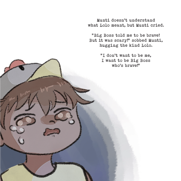 Page 26Munti doesn't what Lolo meant, but Munti cried."Big Boss told me to be brave! But it was scary!" sobbed Munti, hugging the kind Lolo."I don't want to be me, I want to be Big Boss who's brave!"